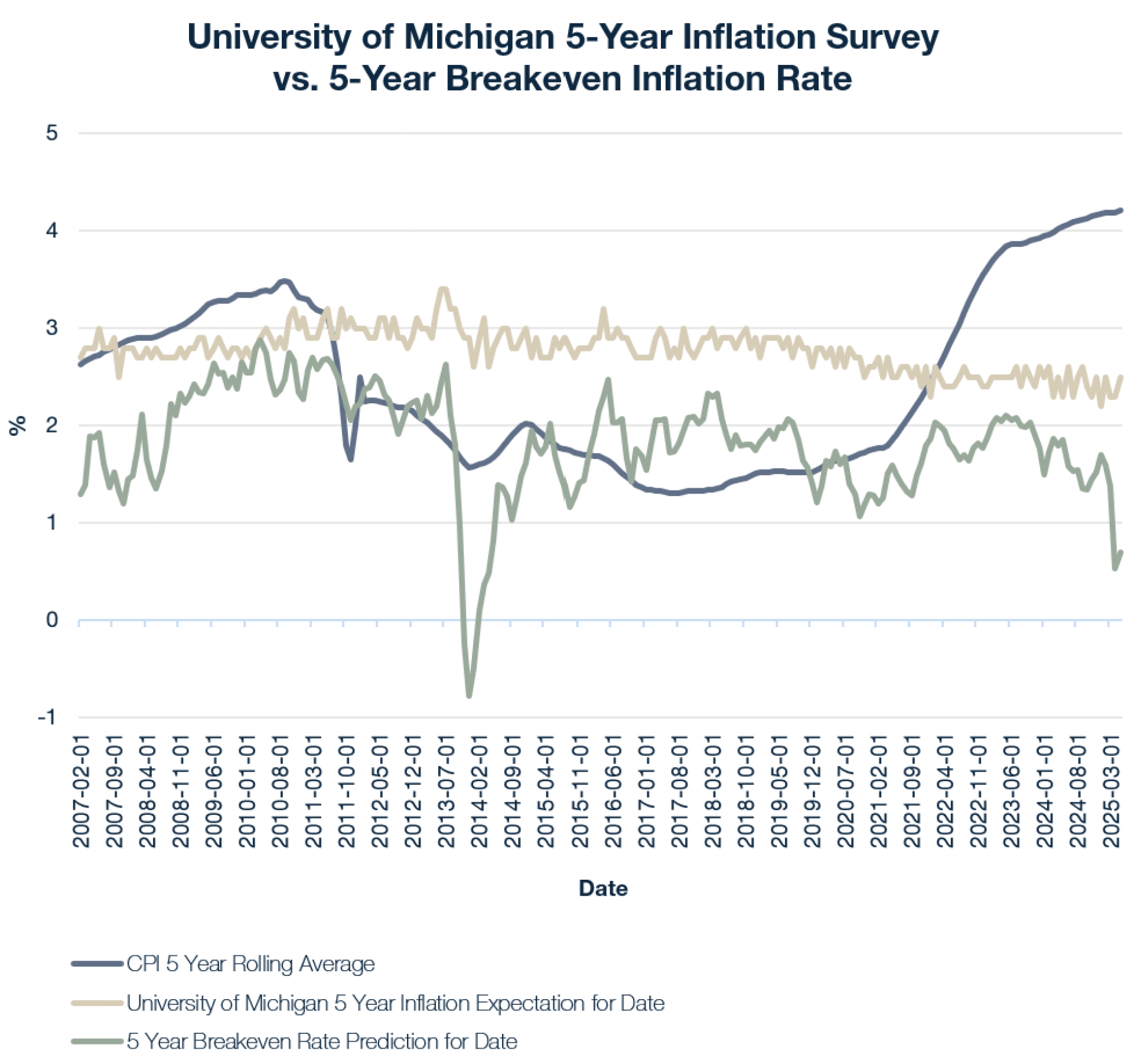 Two widely followed predictors of inflation are the 5-year Breakeven Inflation Rate and the University of Michigan 5-Year Inflation Survey. The 5-Year Breakeven Rate, derived from the bond market, is calculated by subtracting the yield on a 5-year inflation protected bond (TIPS) from the yield on a 5-year nominal treasury bond. The University of Michigan 5-Year Inflation Expectation Survey polls 500 households to gauge household expectations for inflation in the short and medium term. Amongst others, The US Federal Reserve closely monitors both indicators when making interest rate decisions. An important question to consider is: which one is more accurate?